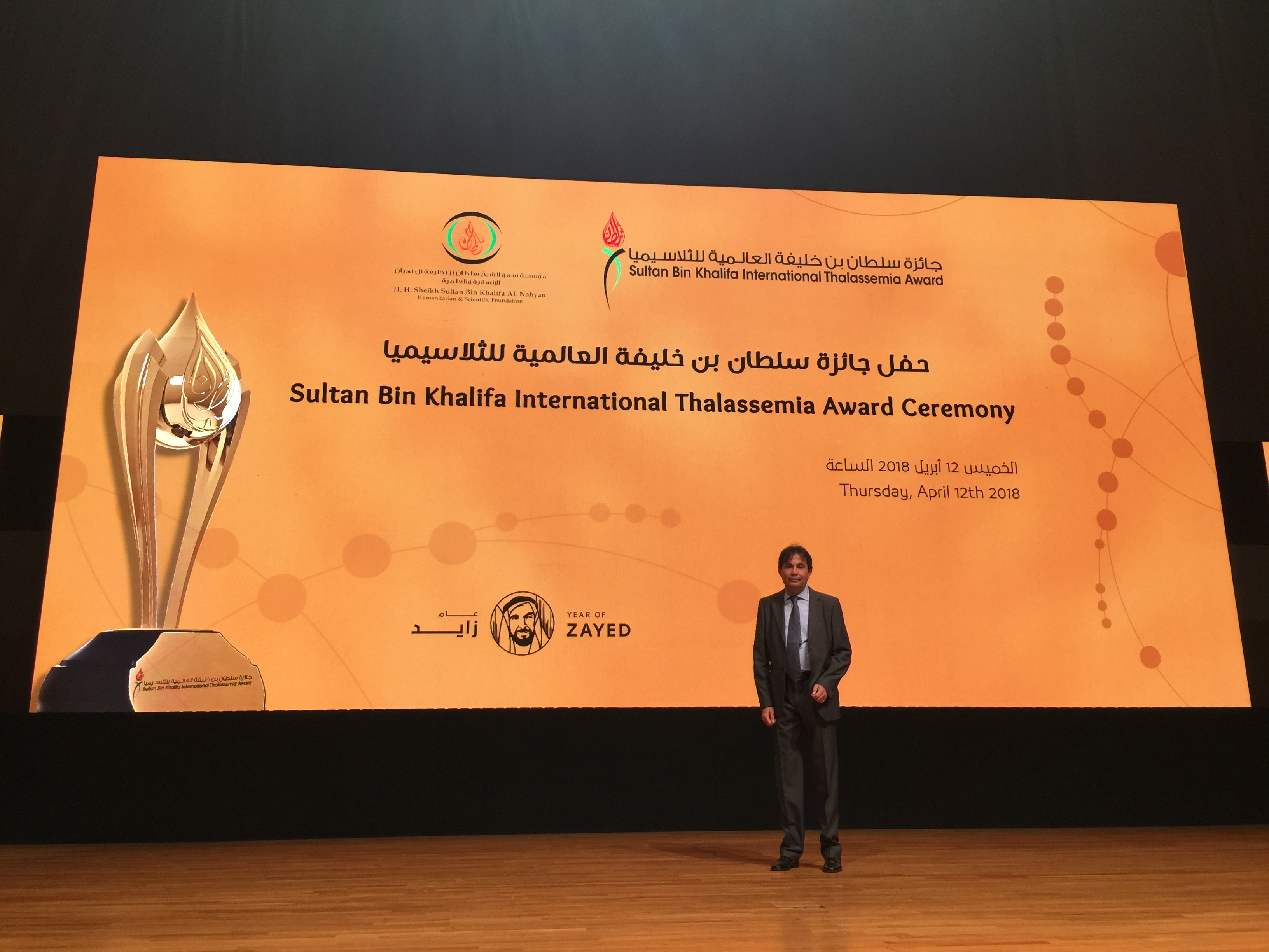 Η τελετή απονομής πραγματοποιήθηκε κατά τη διάρκεια της εναρκτήριας τελετής του «2ου Παναραβικού Συνεδρίου για τη Θαλασσαιμία & τις Αιμοσφαιρινοπάθειες του 8ου Αιματολογικού Συνεδρίου Εμιράτων» στις 12-14 Απριλίου 2018 στο Abu Dhabi (Άμπου Ντάμπι), πρωτεύουσα και δεύτερη μεγαλύτερη πόλη των Ηνωμένων Αραβικών Εμιράτων.